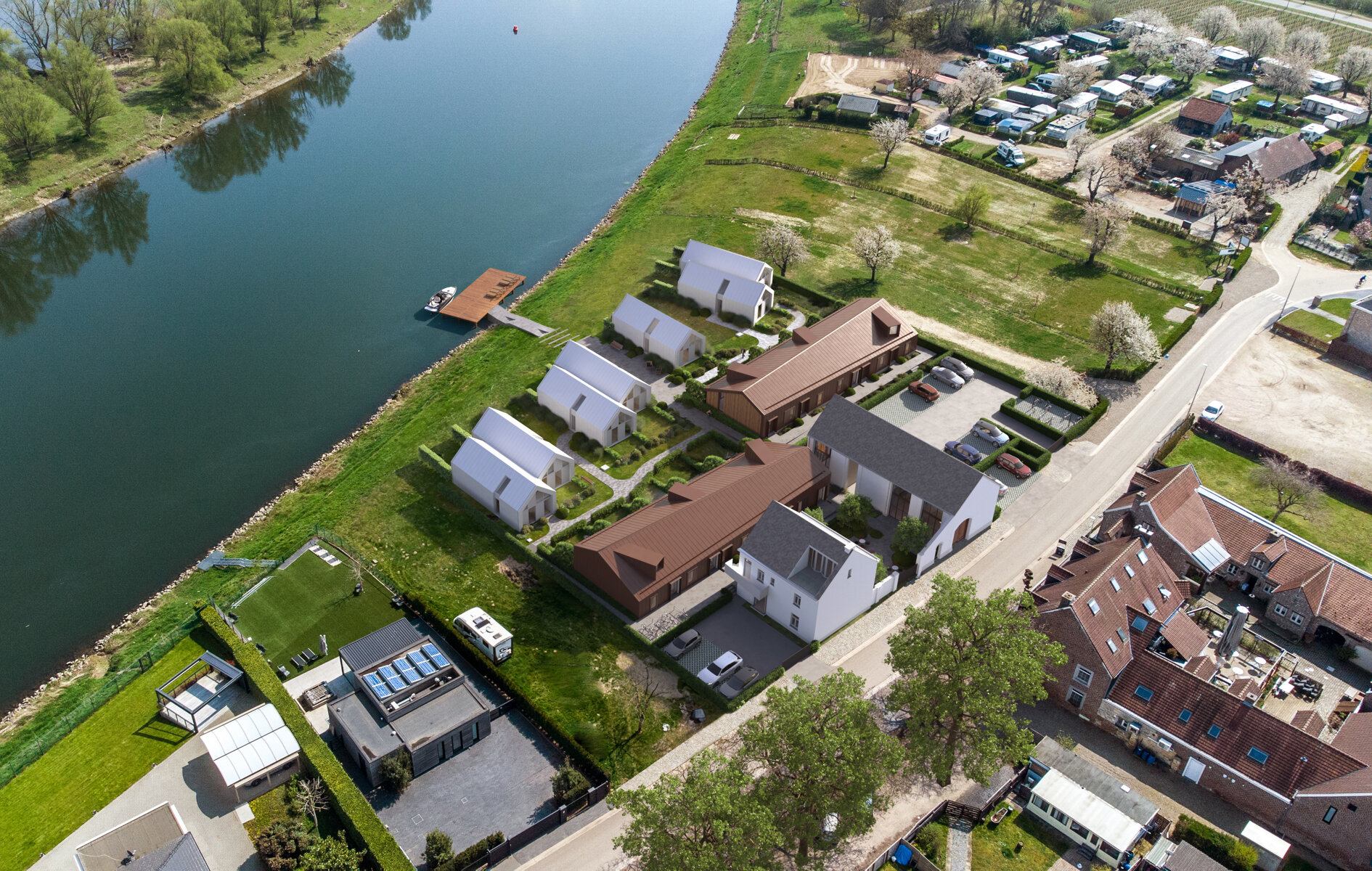 LIGGING Aan de Leeuwerikstraat in het pittoreske Maaslands dorpje Aldeneik verrijzen 20 vakantiewoningen tezamen met 1 conciërgewoning (in de voormalige boerderij). Prachtig én uniek gelegen, pal aan de Maasoever…, dat je hier geniet van een optimale en vooral uiterst rustige ligging is “the least we can say!” Je hebt hier een fantastisch uitzicht op de Maas, veel wandel- en fietsmogelijkheden en een uitgebreid horeca aanbod in de buurt!