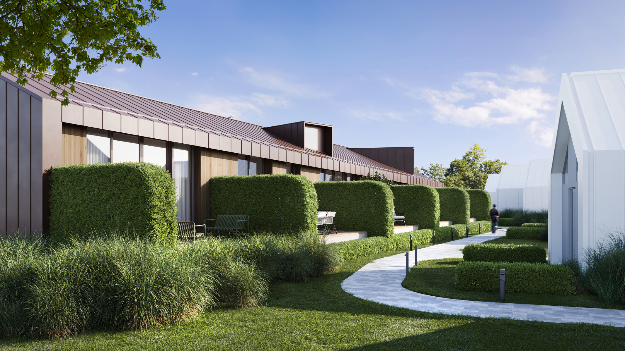 HET PROJECT Het project omvat 20 vakantiewoningen met een oppervlakte tot 72m² en hebben allen 1 slaapkamer en een terras. 13 Woningen hebben zelfs een eigen tuingedeelte. De vakantiewoningen worden onderverdeeld in 7 water-, 10 schakel- & 3 schuurwoningen met elk hun eigen charmes. In de voormalige boerderij wordt 1 conciërgewoning voorzien op de 1ste & 2de verdieping. Het gelijkvloers zal fungeren als een polyvalente ruimte met gemeenschapsfunctie. Jouw wagen parkeren kan op één van de twee gemeenschappelijke parkings. En ook 2 fietsenstallingen zullen niet ontbreken.
