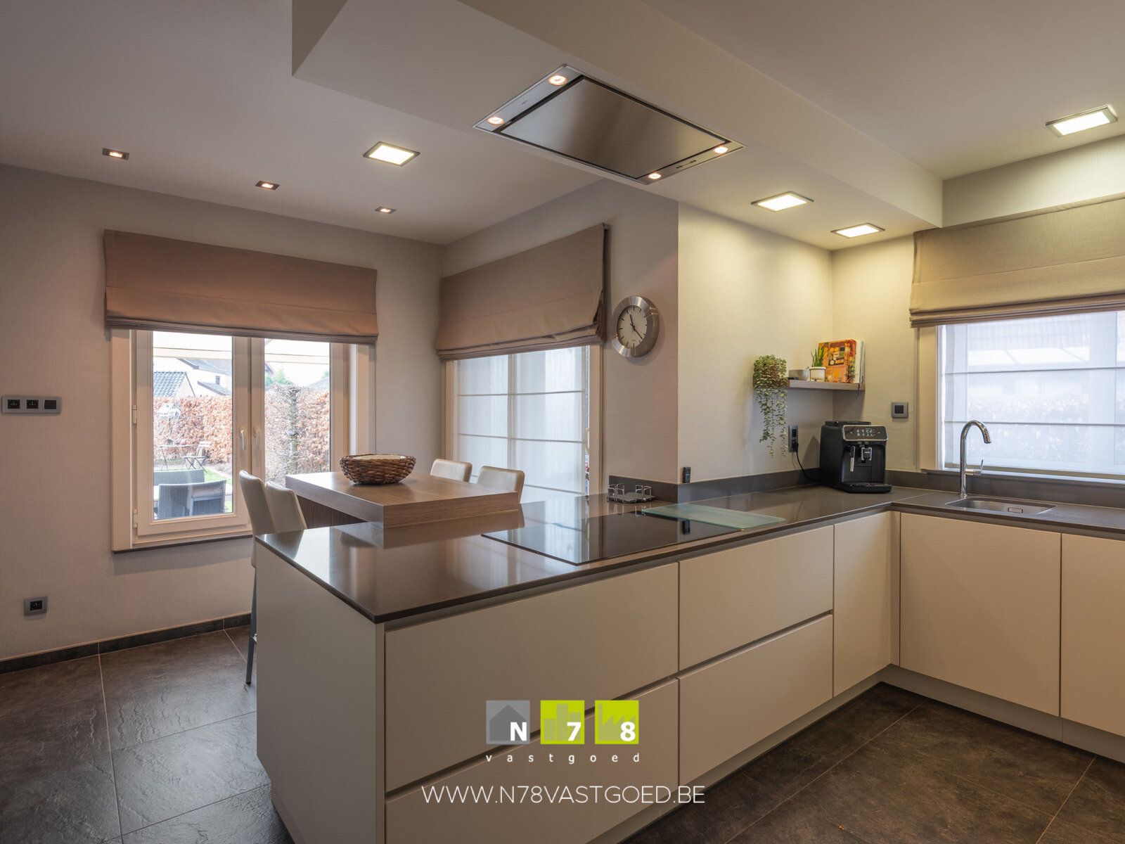 - Keuken ((4,20m x 2,50m) + (2,70m x 2,25m) = 16,58m²): geïnstalleerde keuken met onder-bovenkasten, lades, inductiekookplaat, dampkap, microgolfoven, combi-oven, koelkast, vaatwasser; schuifraam naar ingesloten terras/veranda, tegelvloer.