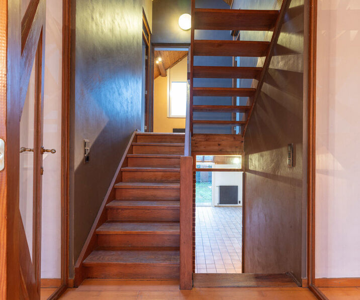 - Inkomhal (2,65m x 1,60m = 4,24m²): trap naar 1ste verdieping, tegelvloer.