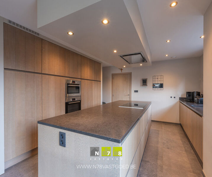 - Keuken (5,00m x 3,40m =17,00m²): keukenwand (koelkast, kastenwand, oven, microgolf), keukeneiland (onderkast, lades, inductiekookplaat, dampkap, werkblad composiet), keukenwand (vaatwasser, onderkast, spoelbak, werkblad composiet), automatische rolluiken, tegelvloer.