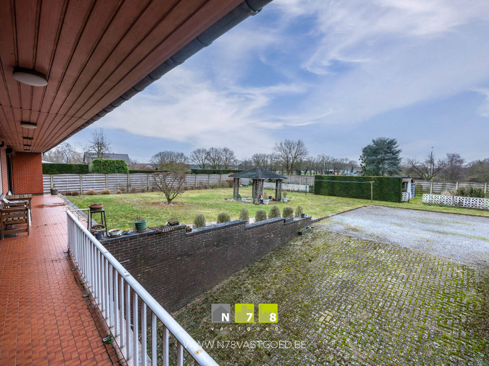 - Overdekt terras met een open uitzicht op de achtertuin.