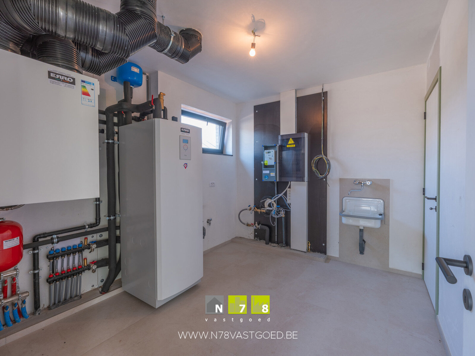 - Wasplaats (3,34m x 2,80m = 9,35m²): aansluiting wasmachine en droogkast, uitgietbak, elektriciteitskast, ventilatiesysteem, warmtepomp, tegelvloer.