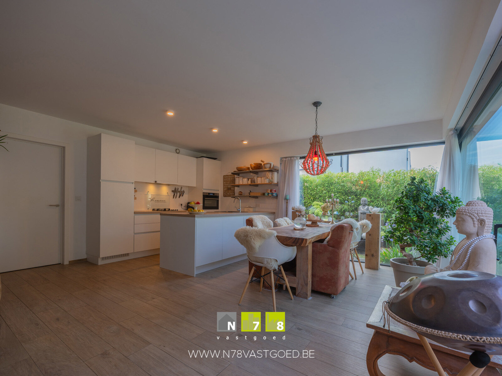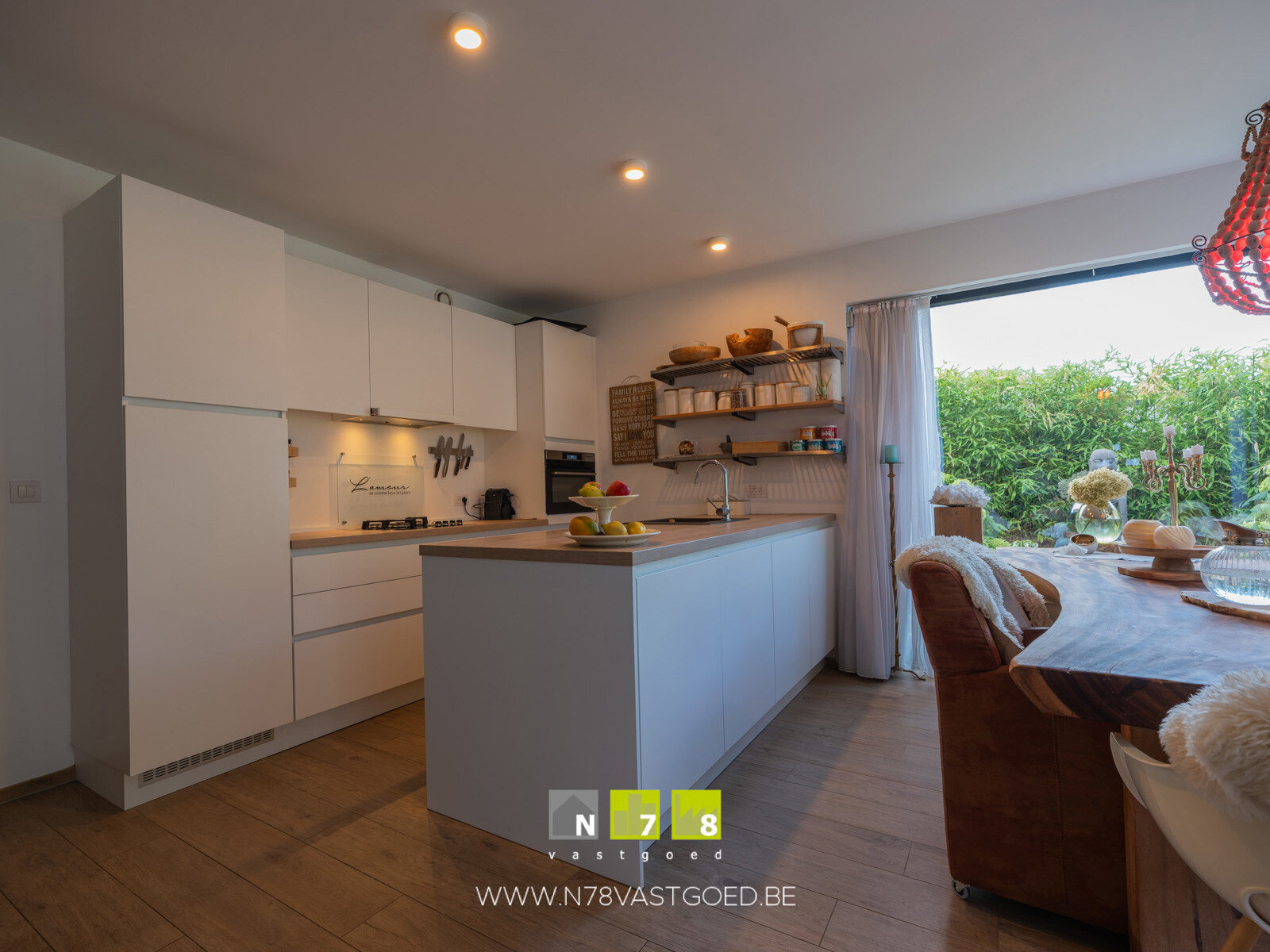- Woonkamer met open keuken ((5,78m x 4,08m) + (5,78m x 3,34m) = 42,89m²) : geïnstalleerde keukenwand met onderkasten, bovenkasten; keukeneiland met spoelbak, onderkasten, betegelde achterwand; schuifraam naar het terras, veel lichtinval dankzij grote raampartijen, laminaat.