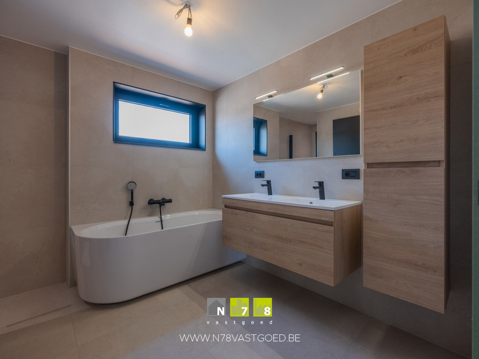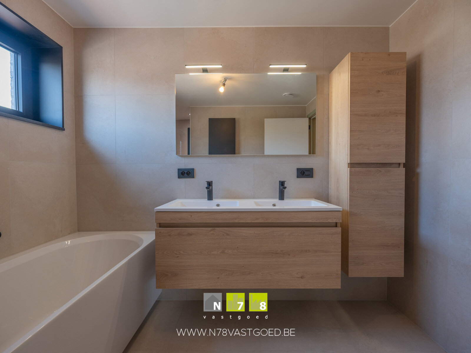 - Badkamer ((2,75m x 2,30m) + (1,00m x 1,15m) = 7,48m²): ligbad, douche, badkamermeubel (dubbele lavabo, lades, kolomkast), wandbetegeling, tegelvloer.