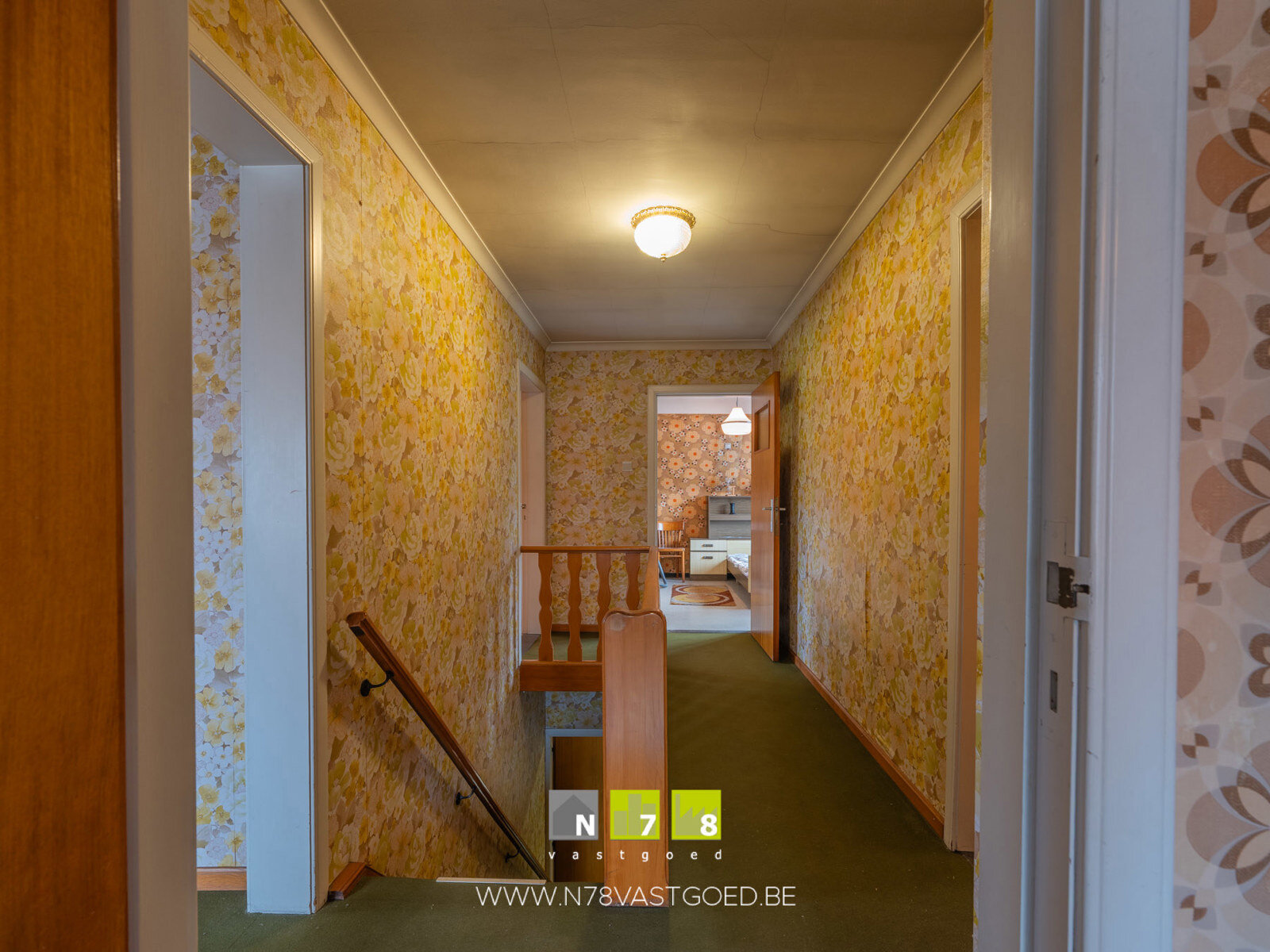 VERDIEPING +01 (BETONNEN TUSSENVLOEREN)- Overloop (1,87m x 4,22m = 7,89m²): houten trap naar het gelijkvloers, tapijt.