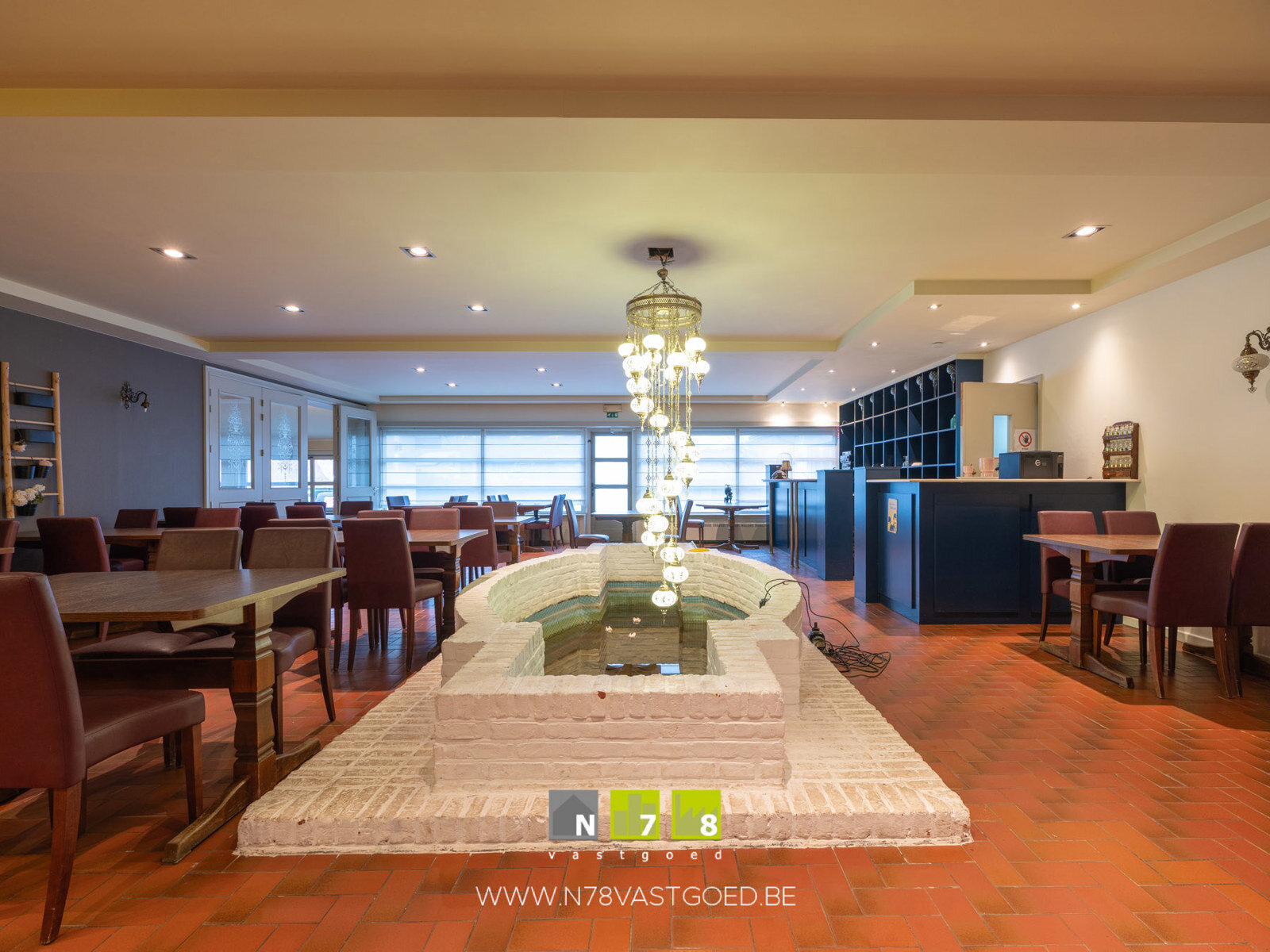 - Restaurant (12,47m x 9,06m = 113,0m²): met bar, doorgang naar toilet, ingericht met tafels en stoelen, siervijver, tegelvloer.