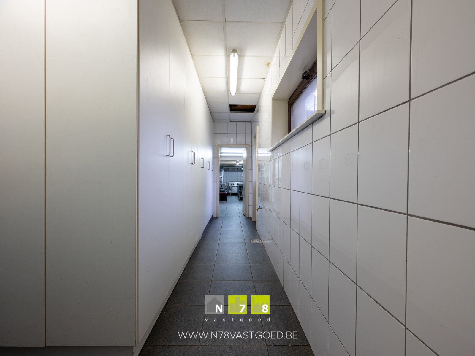 - Keuken ((3,37m x 6,88m) + (3,48m x 2,59m) + (3,21m x 2,84m) = 41,3m²):k oelcel, aluminium werktafels en spoelbakken, doorgang naar feestzaal en restaurant, tegelvloer.