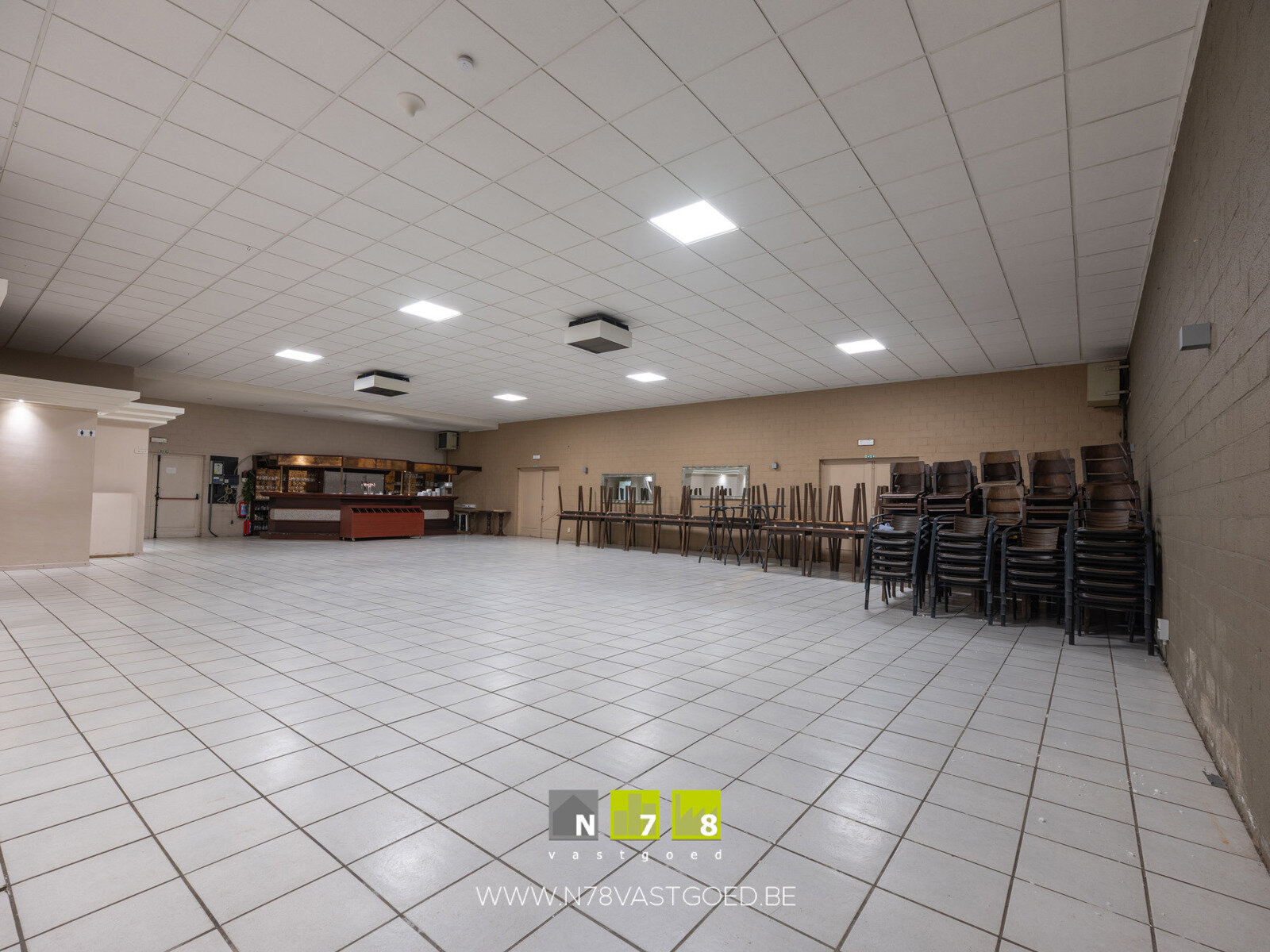 - Feestzaal + sanitair (11,91m x 18,71m = 222,8m²): geïnstalleerd met toog en frigo's, voorzien van 2 nooduitgangen, doorgang naar tuingedeelte, uitgerust met airco-installatie, tegelvloer.