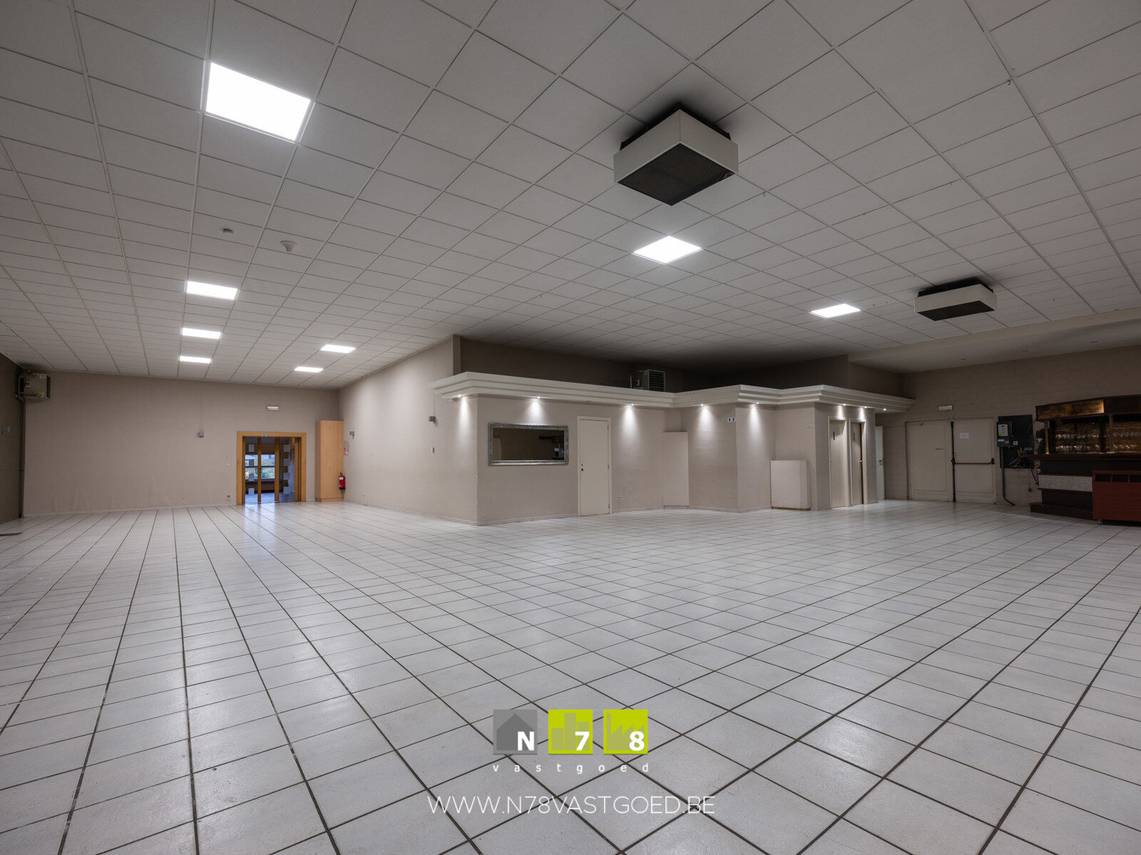- Inkomhal (7,9m x 7,47m = 59,0m²): vestiaire (7m²), ruime ontvangstplaats, doorgang naar feestzaal en restaurant.