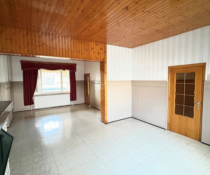 - Leefruimte (33m²): bestaande uit de eetkamer (14m² - 4.00x3.65m) en de zitkamer (19m² - 4.60x4.15m). Tegelvloer.
