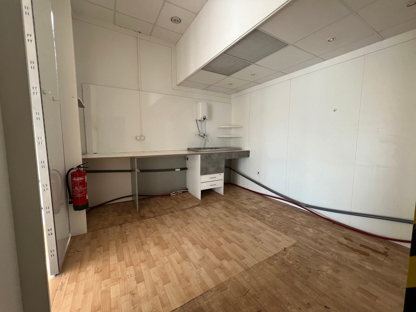- Winkelruimte (8m x 12,20m = 97,60m²): verlaagd plafond, 2 ingangen, laminaat.