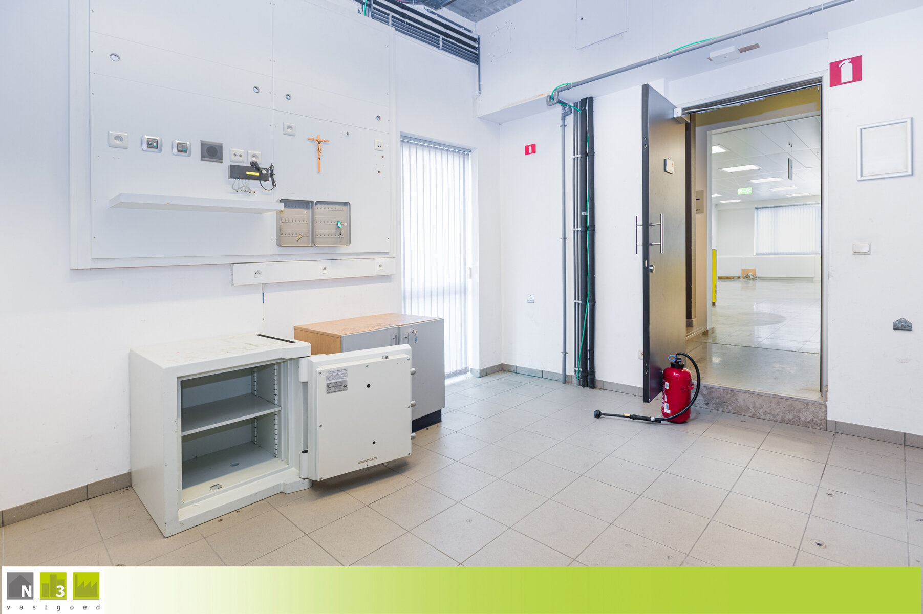 - Inkom 1 (28m²): 7.00x4.00m, dit was de ruimte waar vroeger de geldautomaten stonden. Voorzien van een buitendeur en veel vitrines en lichtinval. Afgescheiden met de achtergelegen berging dmv een wand dus gemakkelijk nog groter te maken waardoor het ook kan dienen als winkelruimte of kantoorruimte. Tegelvloer.