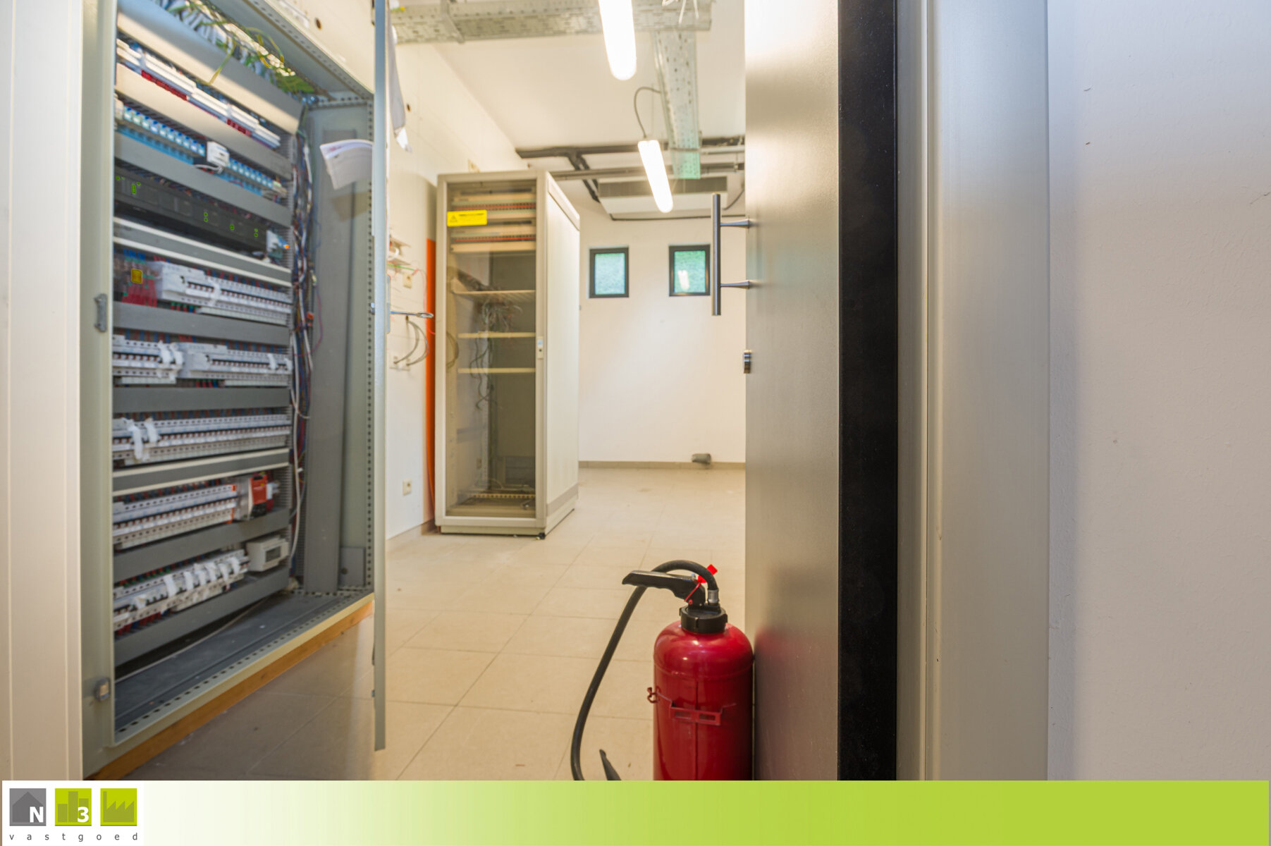- Bureel-/ontvangsruimte (+/- 140m²): ongeveer 12.00x12.00m, ingericht als moduleerbare landschapskantoren. Tegelvloer.