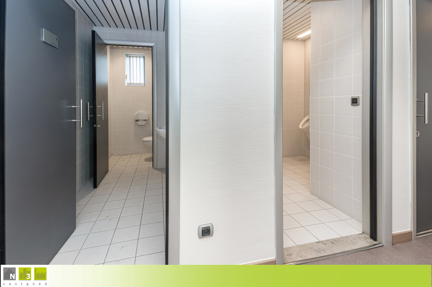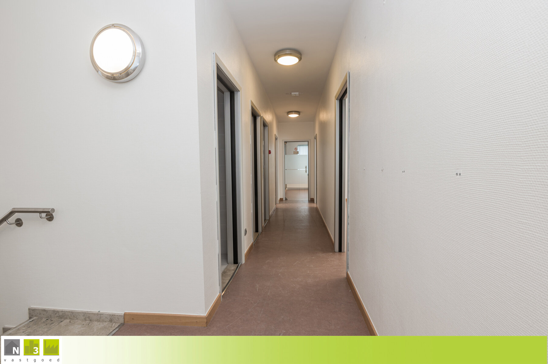 VERDIEPING +01 - WELFSELS ALS TUSSENVLOER: - Gang (12m²): 10.00x1.20m met toegangsluik naar de zolder. Linoleumvloer. - Damestoilet (5m²): 3.50x1.40m. Hangtoilet met handenwasser. Volledige wandbetegeling en tegelvloer. - Herentoilet (7.50m²): 3.50x2.20m. Hangtoilet, urinoir en handenwasser. Volledige wandbetegeling en tegelvloer. - Eetruimte met kitchenette (27.50m²): 7.55x3.65m. Kitchenette met kasten, een vaatwasmachine, ingebouwde koelkast en een lavabo. Linoleum. - Bureau (19.50m²): 4.55x4.30m. Linoleumvloer. - Bureau (23m²): 7.00x3.30m. Linoleumvloer.