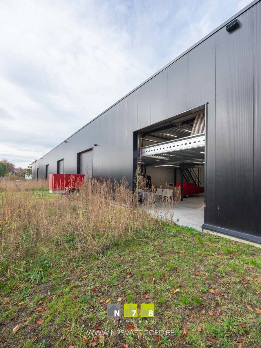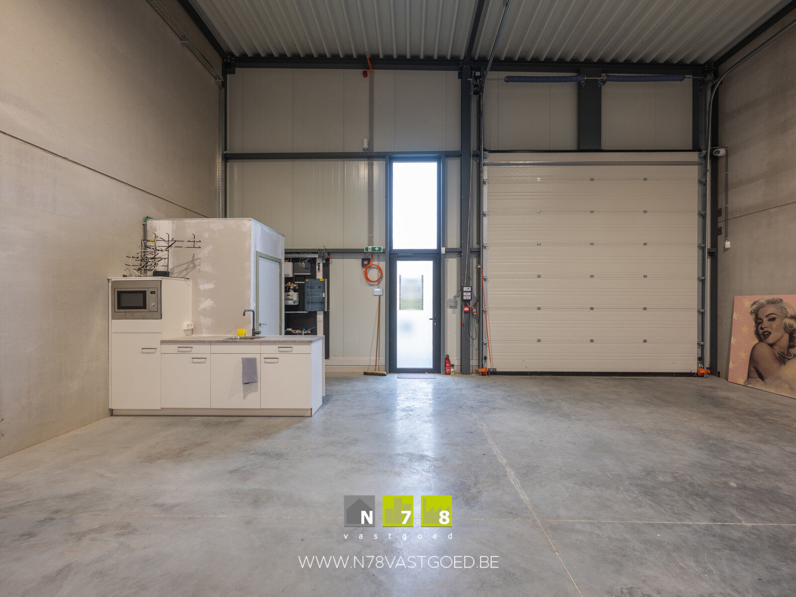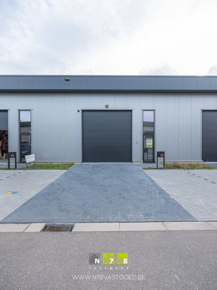 KENMERKEN - gelijkvloers: 182m² - verdiepingsvloer: 90m² (9,70x9,35m) - 2 sectionaalpoorten: 4m breed x 4.20m hoog - vrije hoogte: 6m - gepolierde betonvloer - lichtstraat met rookluiken - loopdeur in glas met bovenglas - kitchenette - toilet