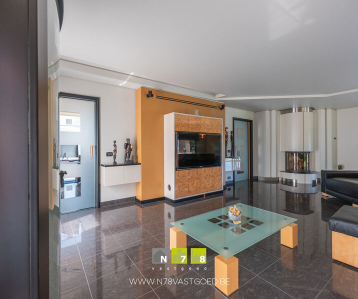 - Badkamer 1 (18,50m²): ligbad, stoomdouche, hangtoilet, 2 afzonderlijke lavabo's met maatkasten, natuurstenen afwerking, sierradiator, muziekinstallatie, keramische tegelvloer.