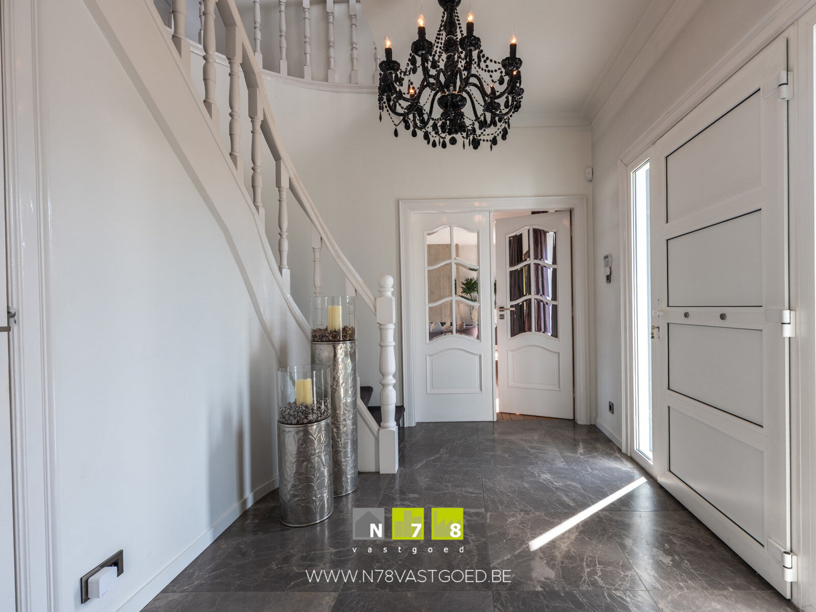 - Hal (3,75m x 2,30m = 8,63m²): vestiairehoek, marmeren vloer.