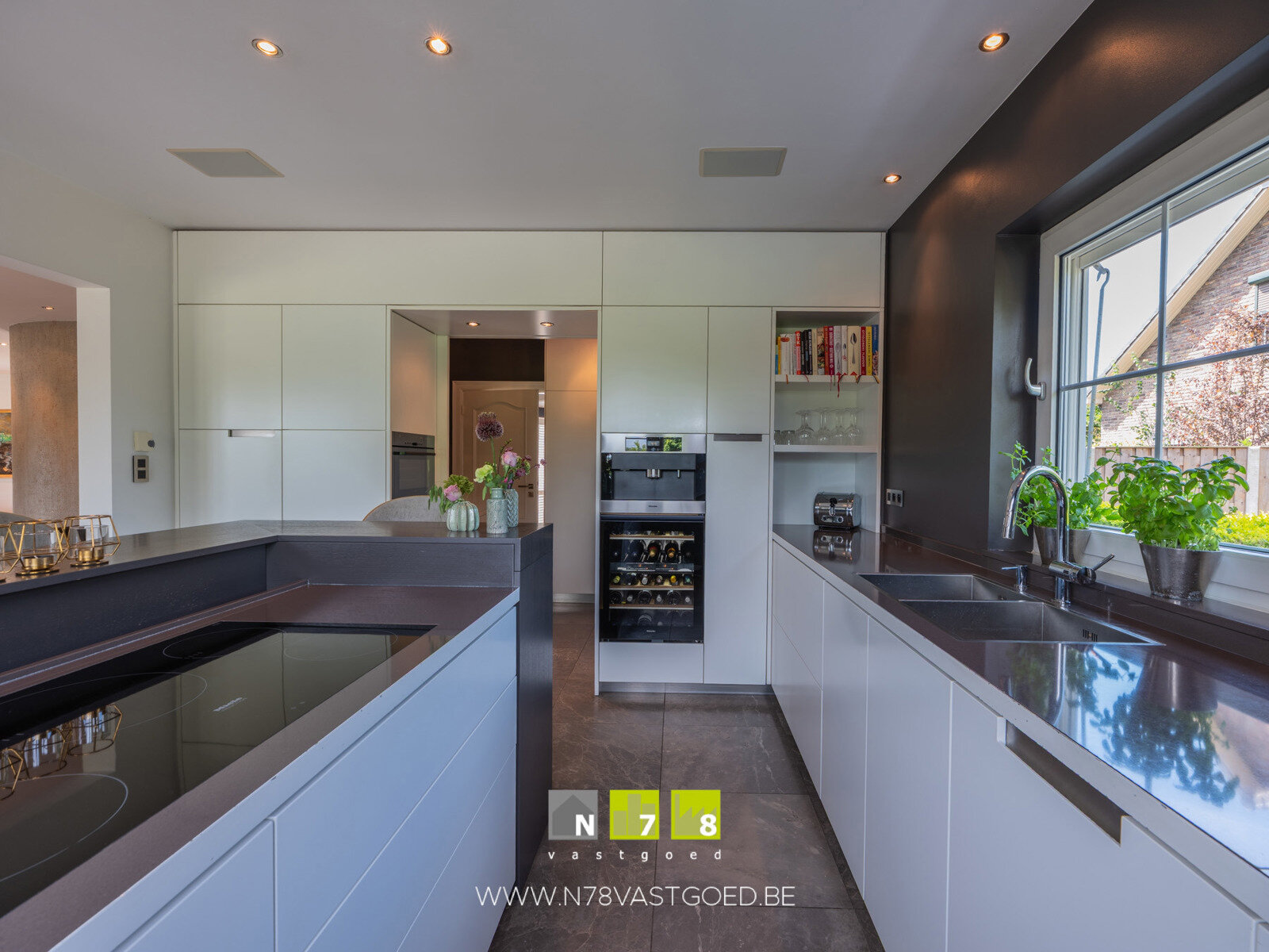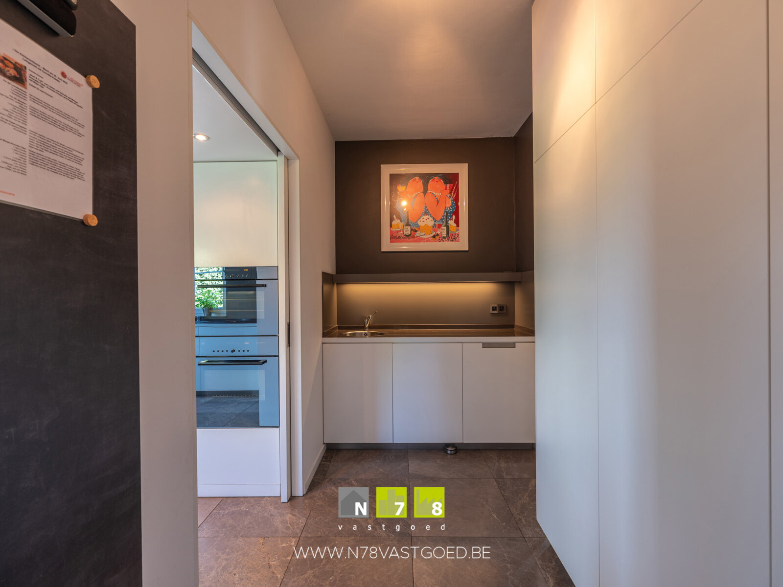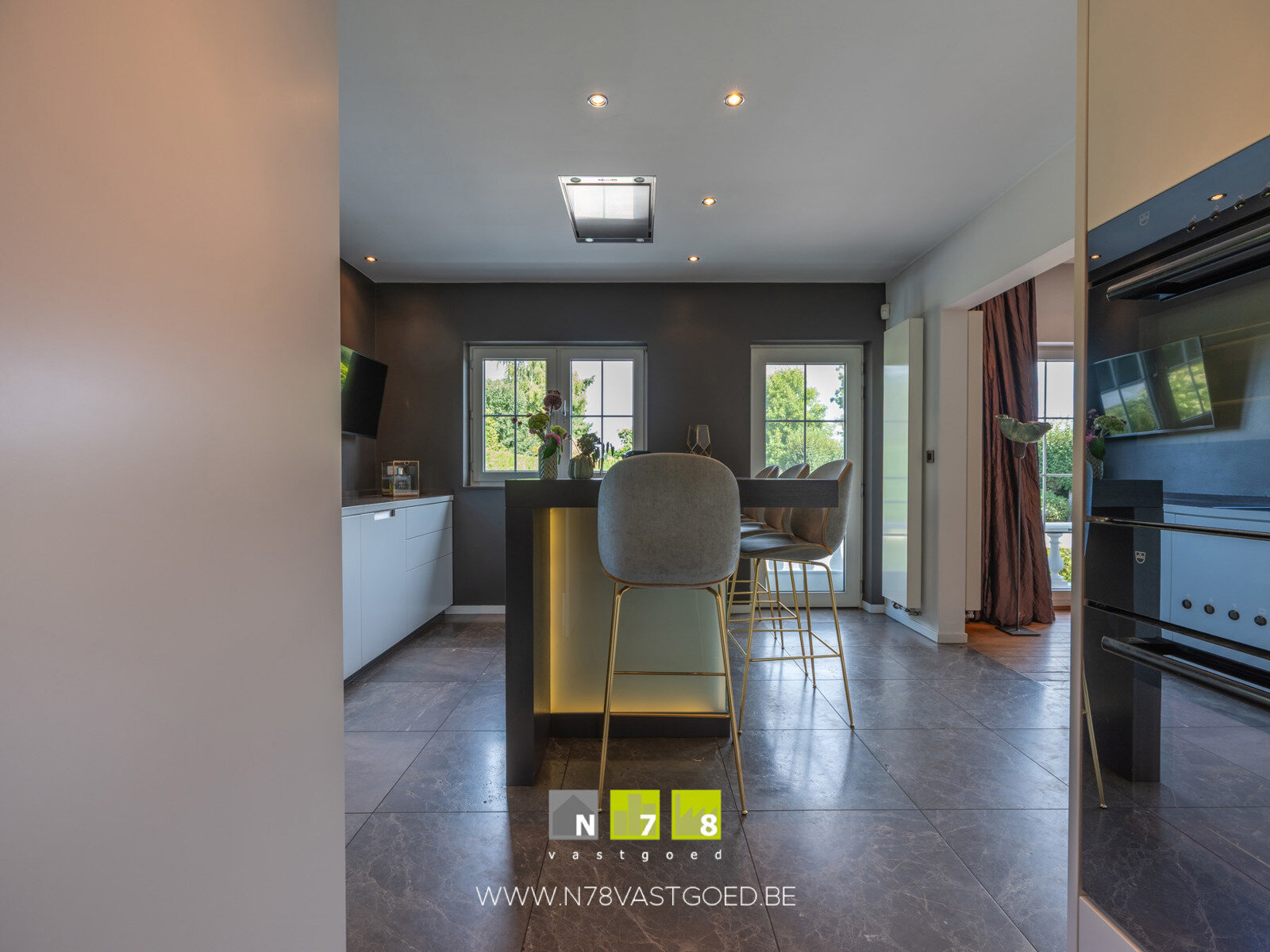 - Keuken (4,30m x 4,20m = 18,06m²): onder- en bovenkasten, koelkast, combi-oven, keukeneiland (koffiezet, wijnkoeler, vaatwasser, inductiekookplaat, dampkap), keukenwand (lades, vaatwasser, dubbele spoelbak), deur naar terras, marmeren vloer.