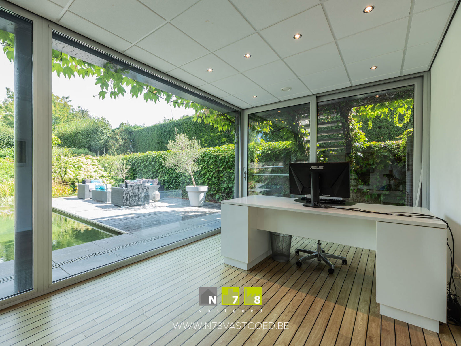 - Kantoor/polyvalente ruimte (6,00m x 7,00m = 42,00m²): aparte zij-ingang, inkomhal, inbouwkasten, ingebouwde luidsprekers, dimbare inbouwspots, alarminstallatie, PVC-vloer (teak look).