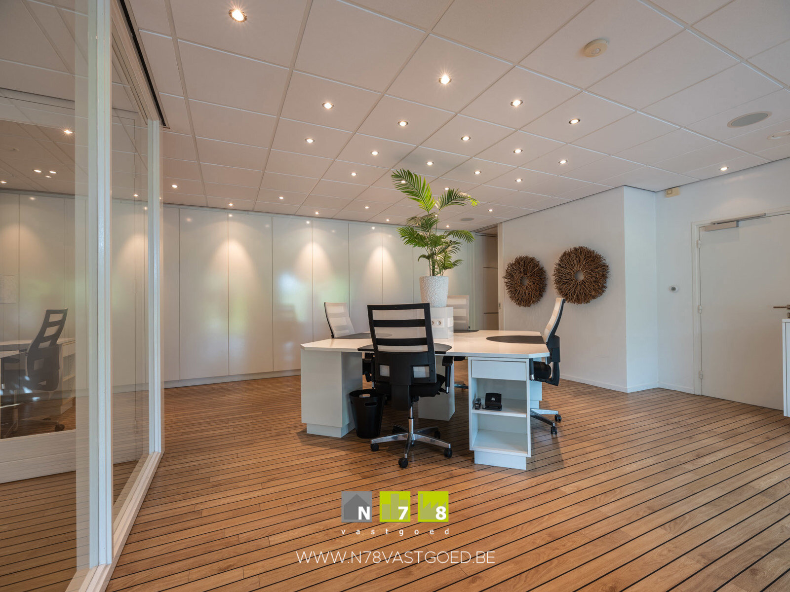 - Bureau (7,15m x 5,30m = 37,90m²): bureau, wandkasten, parketvloer.