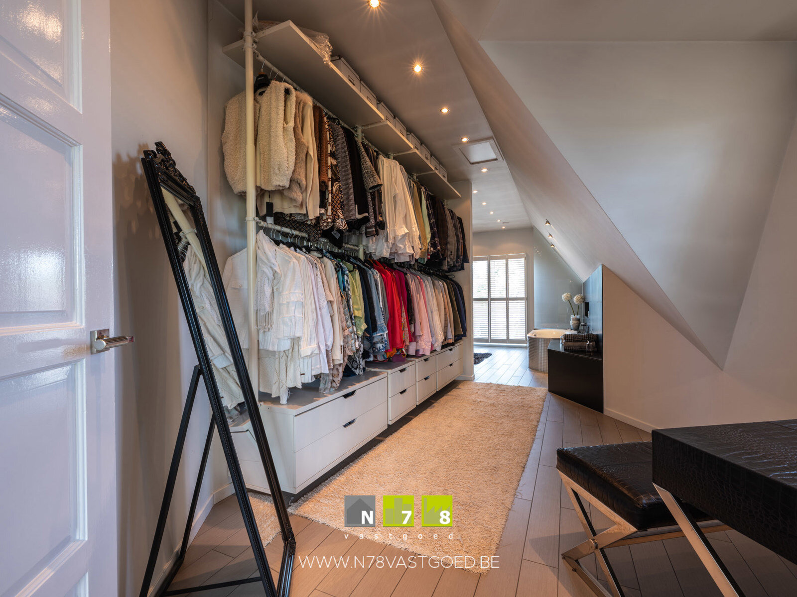- Dressing (2,20m x 5,40m = 11,88m²): inloopdressing, vloerverwarming, tegelvloer.