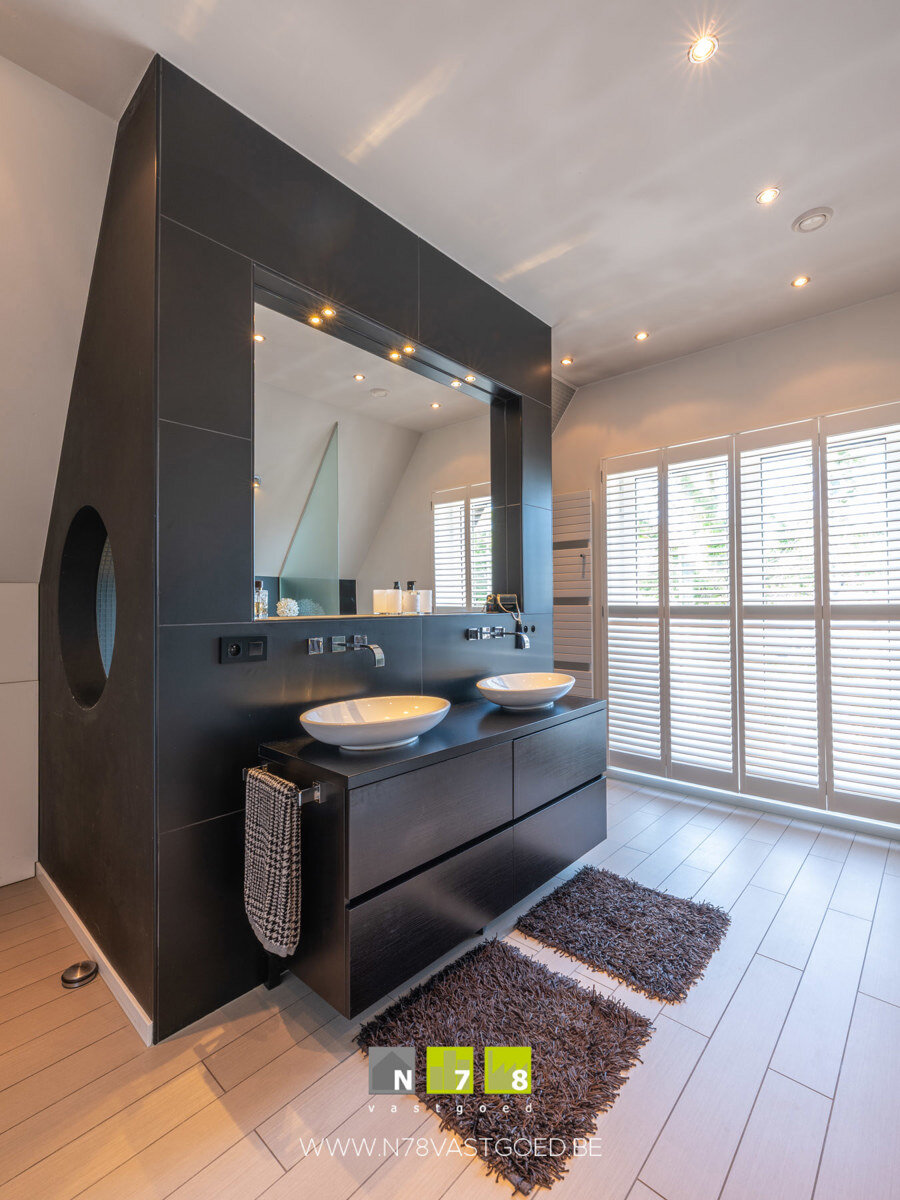 - Badkamer 1 (3,80m x 4,30m = 16,34m²): ligbad, badkamermeubel (dubbele lavabo, lades), (regen)douche/stoomcabine, hangtoilet, toegang tot balkon, TV-aansluiting, dimbare spots, vloerverwarming, tegelvloer.