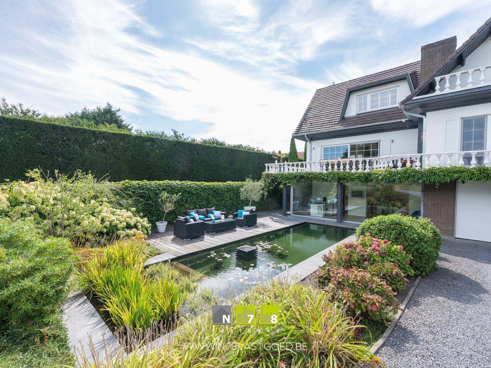- Buitenruimte met vijverpartij, terrassen, tuinhuis en automatische toegangspoort, volledig voorzien van beregeningssysteem.